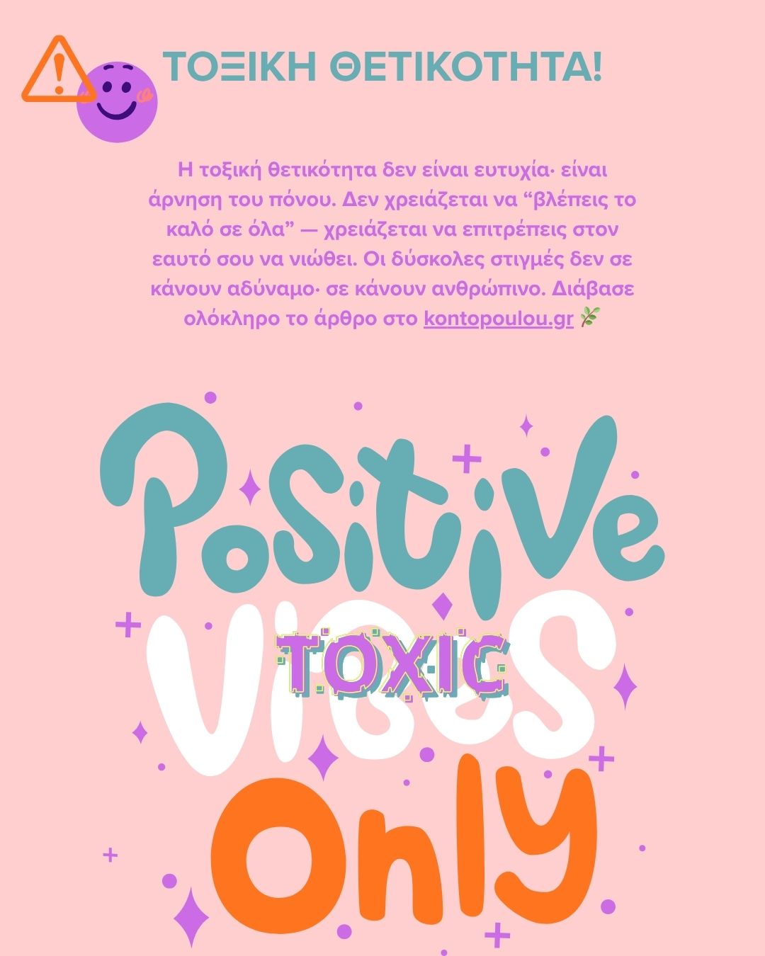 Η τοξική θετικότητα είναι ένα φαινόμενο που έχει αρχίσει να απασχολεί έντονα την ψυχολογία τα τελευταία χρόνια. Πρόκειται για την υπερβολική και συχνά εξαναγκαστική έμφαση στη θετική σκέψη, η οποία οδηγεί στην απόρριψη ή την υποτίμηση των αρνητικών συναισθημάτων. Με άλλα λόγια, όταν κάποιος επιμένει να «βλέπει τη φωτεινή πλευρά» σε κάθε κατάσταση, ακόμα και στις πιο δύσκολες, συχνά καταλήγει να αρνείται την πραγματικότητα των συναισθημάτων του ή των άλλων. Φράσεις όπως «μην στεναχωριέσαι, σκέψου θετικά» ή «όλα γίνονται για κάποιο λόγο» φαίνονται καλοπροαίρετες, αλλά στην πραγματικότητα λειτουργούν ως τρόποι αποφυγής του πόνου και ακύρωσης της ανθρώπινης εμπειρίας.